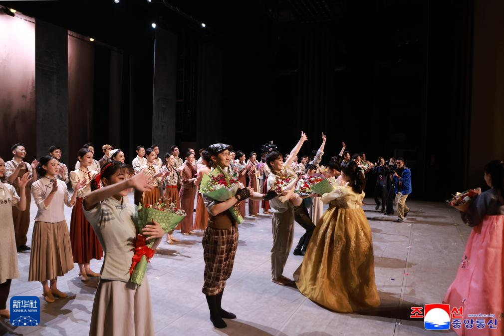 这张朝中社提供的图片显示,10月9日,在朝鲜首都平壤,红色经典舞剧《永不消逝的电波》的演员向观众挥手致意。