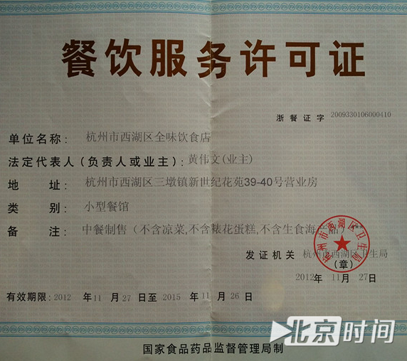 该店铺在大众点评网公示的商家信息显示,营业执照名称为杭州市西湖区全味饮食馆,经营者姓名为黄伟文,经营场所为新世纪花苑39-40号营业房,经营范围为中餐制售(不含凉菜、裱花蛋糕、生食海产品,有效期至2015年11月26日,经向环保部门排污申报后方可经营)。