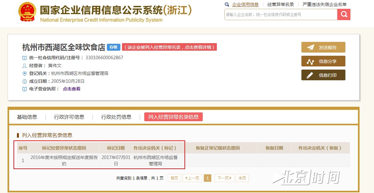 在国家企业信用信息公示系统(浙江)中北京时间记者查询到,杭州市西湖区全味饮食店成立时间为2005年10月28日,处于存续状态。不过,因为2016年度未按照规定报送年度报告,该店铺被列入经营异常名录。