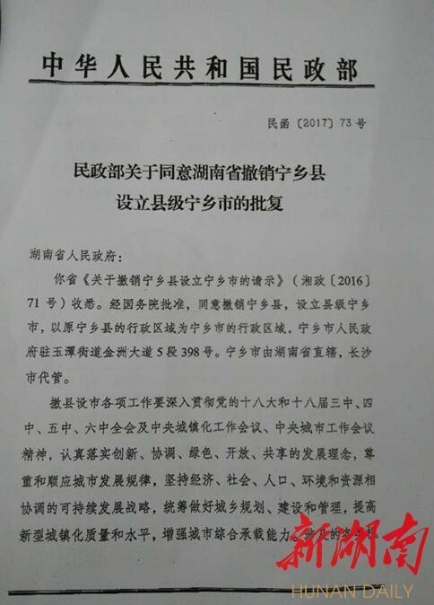 今天,记者获悉,经国务院批准,同意撤销宁乡县,设立县级宁乡市,以原宁乡县的行政区域为宁乡市的行政区域。宁乡市人民政府仍驻玉潭街道金洲大道5段398号。宁乡市由湖南省直辖,长沙市代管。