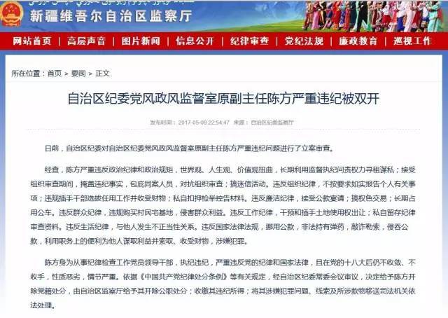 2016年12月15日,新疆纪委官网发布,"新疆维吾尔自治区纪委党风政风监督室副主任(自治区人民政府纠正行业不正之风办公室副主任)陈方涉嫌严重违纪,目前正接受组织调查。"