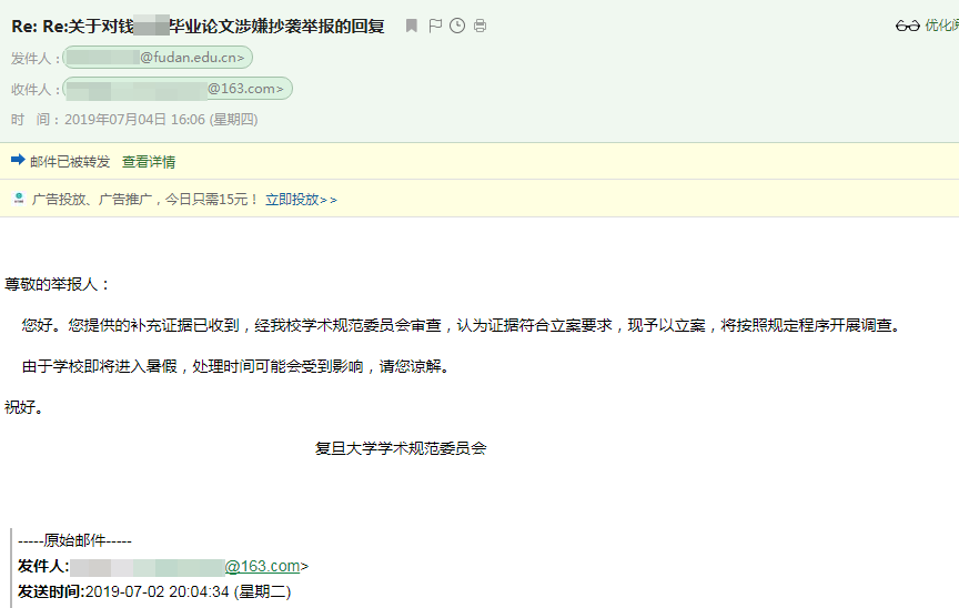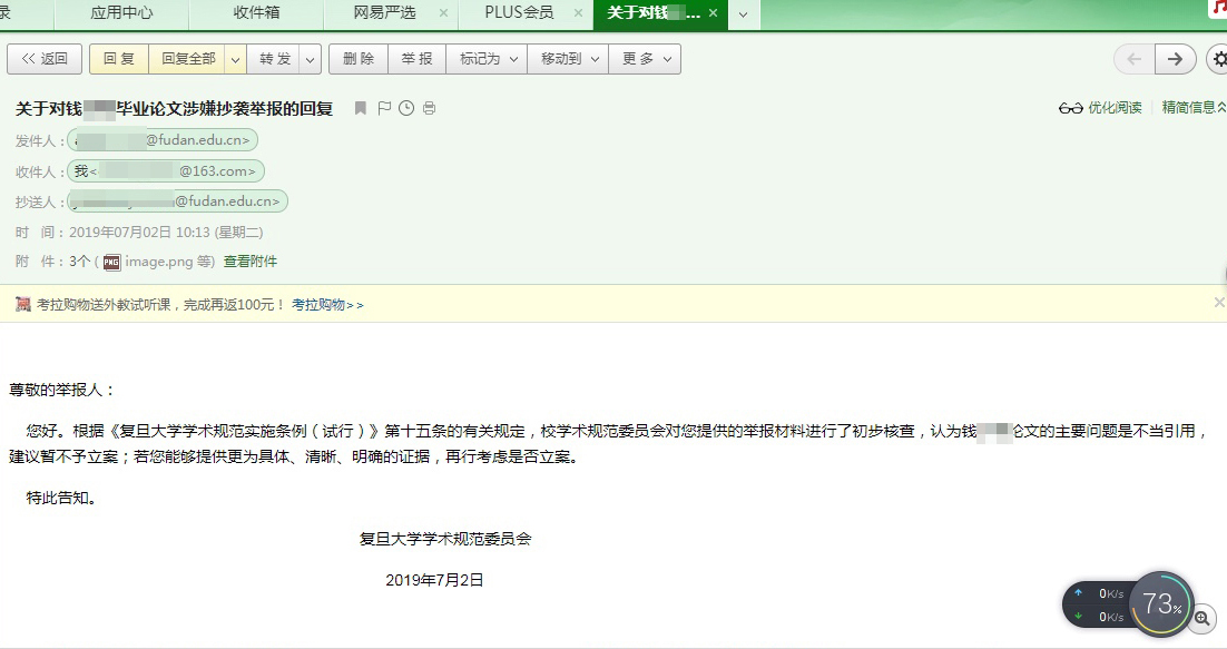 7月2日,网友“argo”收到了复旦大学学术规范委员会的邮件。该邮件称:“校学术规范委员会对您提供的举报材料进行了初步核查,认为钱某某论文的主要问题是不当引用,建议暂不予立案;若您能够提供更为具体、清晰、明确的证据,再行考虑是否立案。”