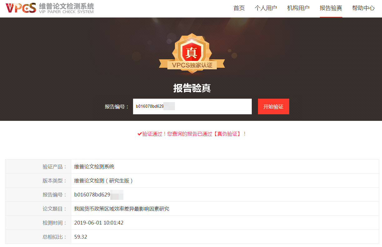 钱某某论文《我国货币政策区域效率差异最影响因素研究》维普论文检测报告总相似比为59.32。 举报人供图
