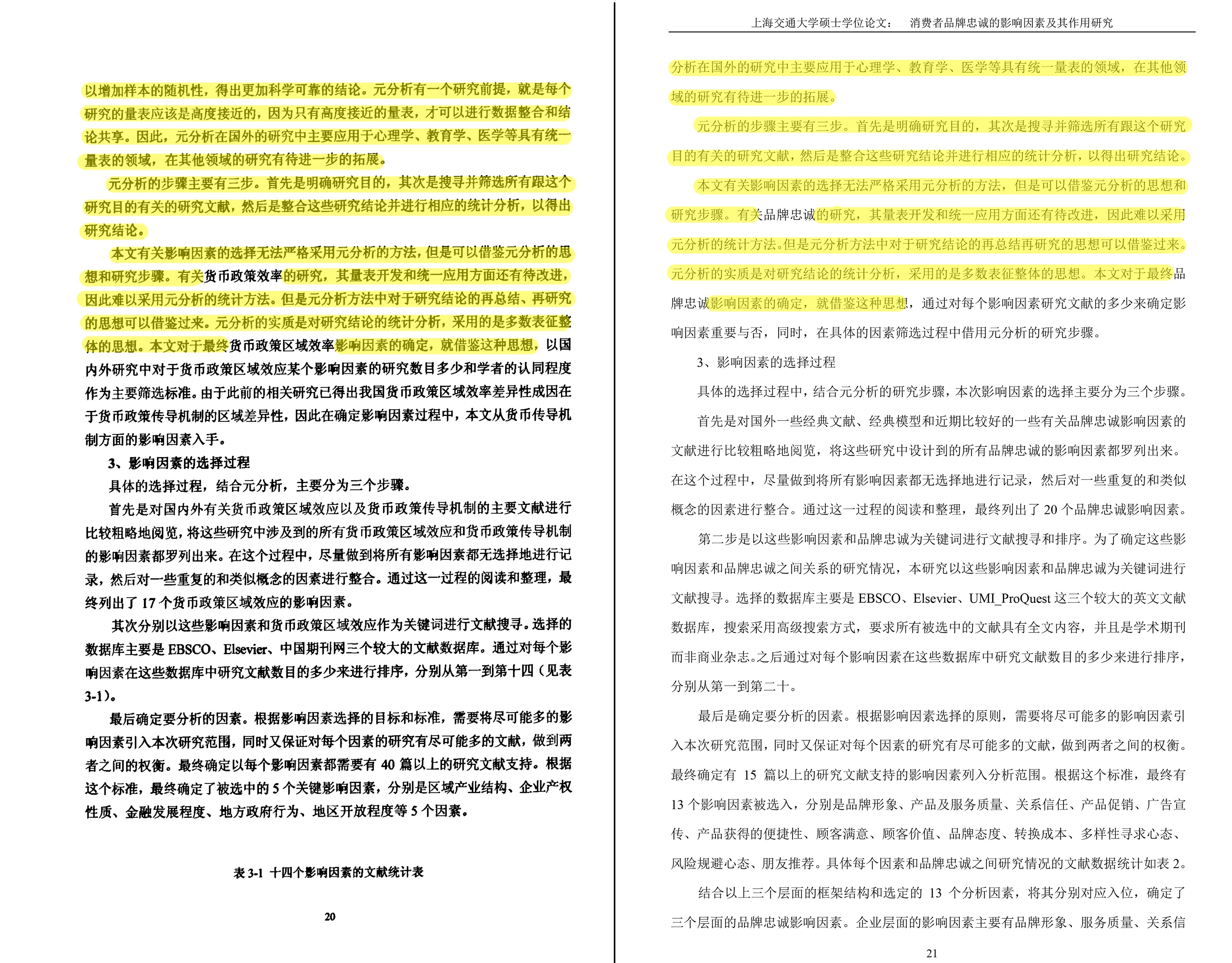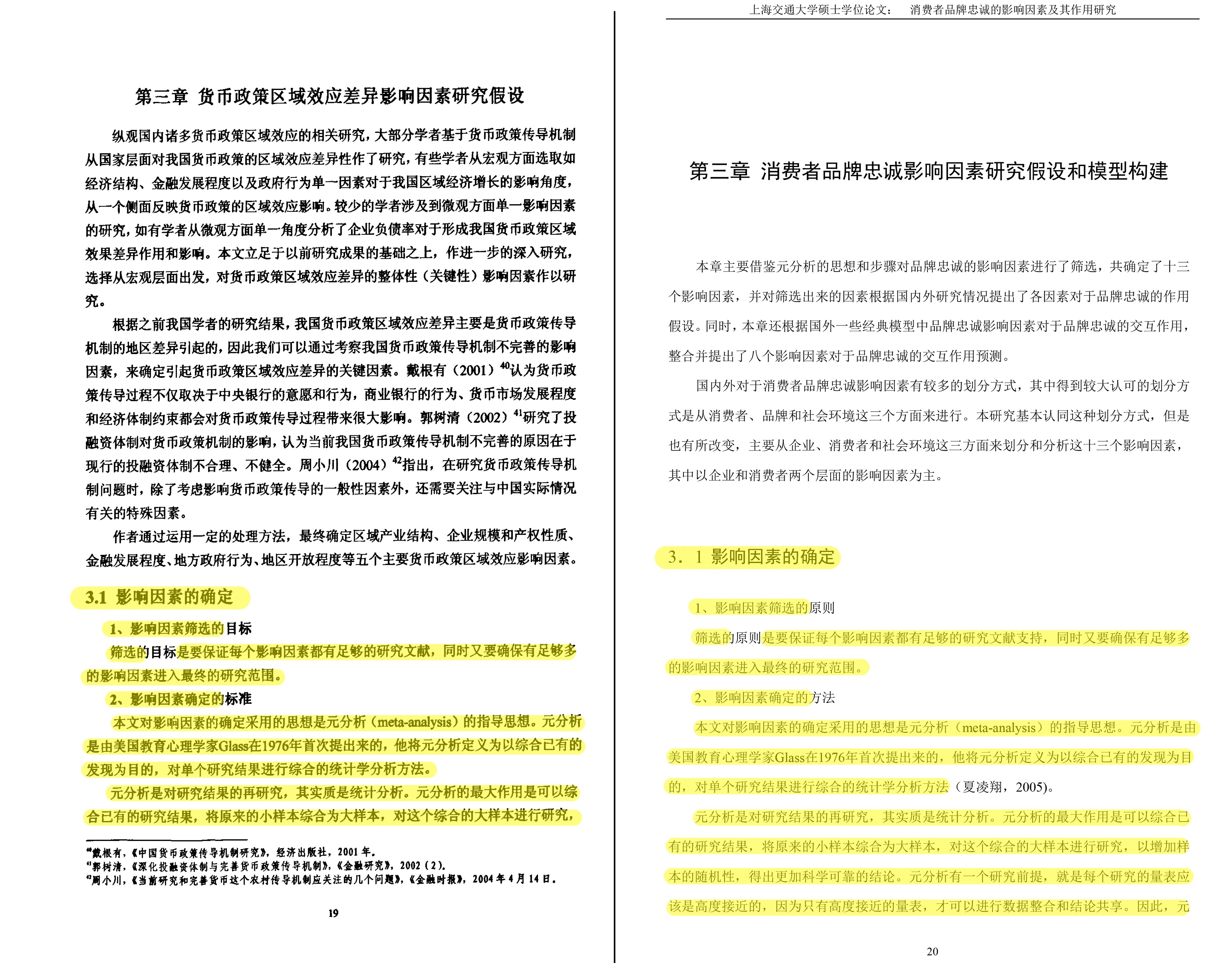 钱某某论文《我国货币政策区域效率差异最影响因素研究》(左)与华某某论文《消费者品牌忠诚的影响因素及其作用研究》(右)部分段落极为相似(黄色部分)。