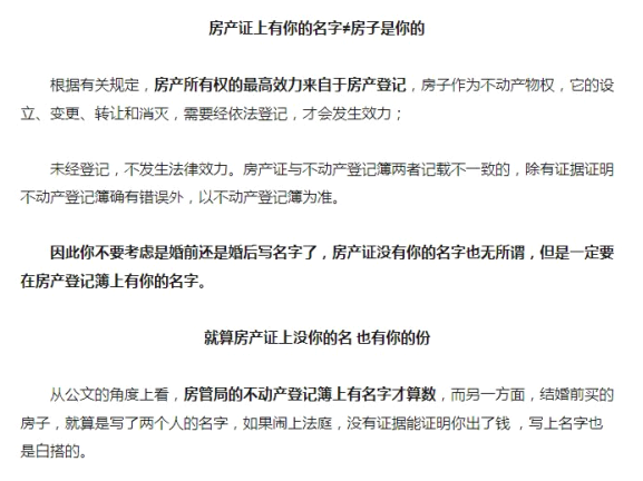 可以看到,文中称,房产所有权的最高效力来自不动产登记,也就是说房产证有你的名字,不动产登记簿如果没有,那照样没有房。所以房产证没有你的名字无所谓,一定要在不动产登记薄加上名字。但这个说法,是不准确的!