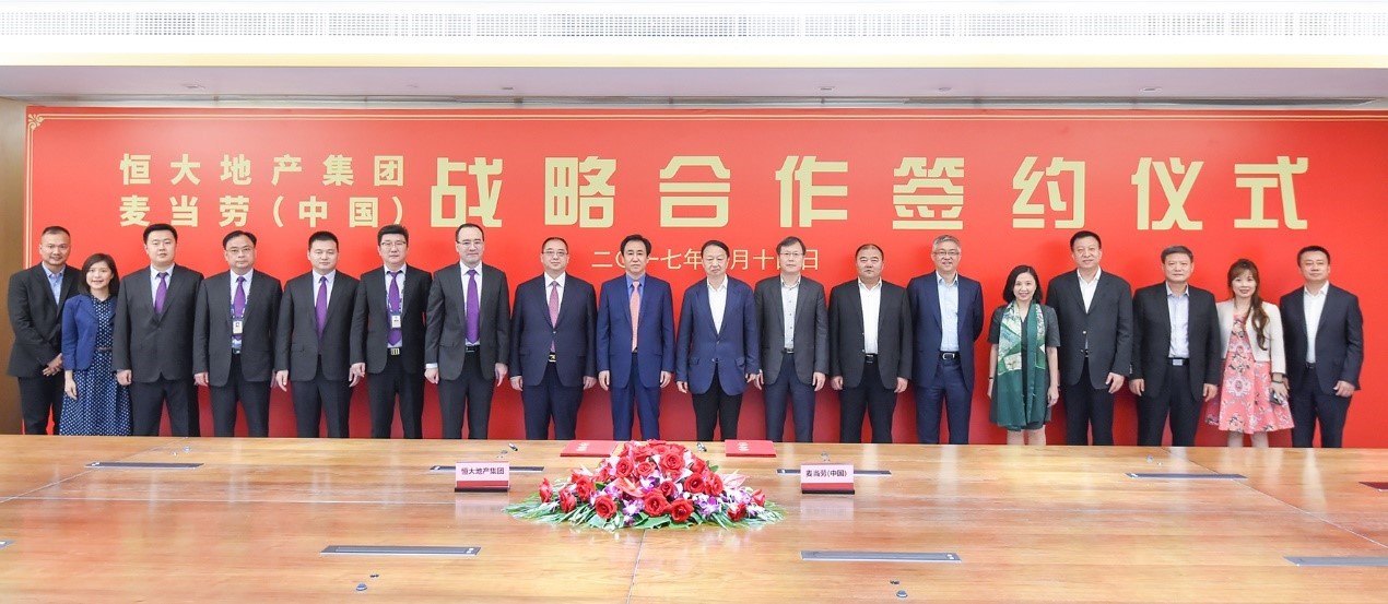 8月14日,恒大地产集团与麦当劳(中国)签订长期战略合作协议,恒大集团董事局主席许家印,恒大集团董事局副主席、总裁夏海钧,恒大集团常务副总裁兼恒大地产集团总裁时守明;中国中信集团董事长常振明,中信集团总经理助理兼中信证券董事长张佑君,中信银行行长孙德顺,中信资本董事长兼麦当劳中国董事会主席张懿宸等出席了签约仪式。