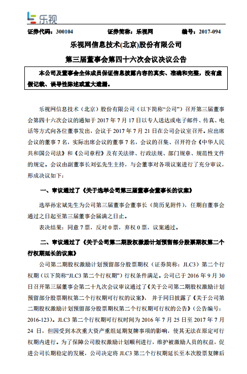 在7月17日的股东大会上,乐视网董秘赵凯表示,乐视网将在三日后召开董事会,选举新的董事长和确定董事会各下属委员会的委员。随后,董事会延期至7月21日举行。
