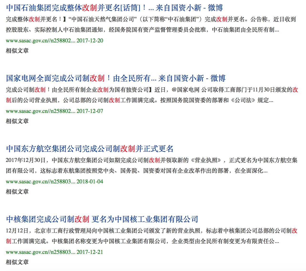 长安街知事(微信ID:Capitalnews)发现,自去年12月以来,已有东航、中石油、国家电网、中核、中国化工等十几家巨无霸央企宣布完成改制及名称变更,它们的公司名都加入了“有限“两个字,如中国核工业集团公司变更为中国核工业集团有限公司,中国石油天然气集团公司变更为中国石油天然气集团有限公司。