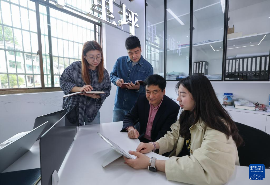 4月4日,郦泱泱(右一)、冯贝贝(左一)、周烨(左二)与十里坪村党总支书记卓任翔(右二)进行座谈,商讨最新的短视频拍摄主题。新华社记者 徐昱 摄