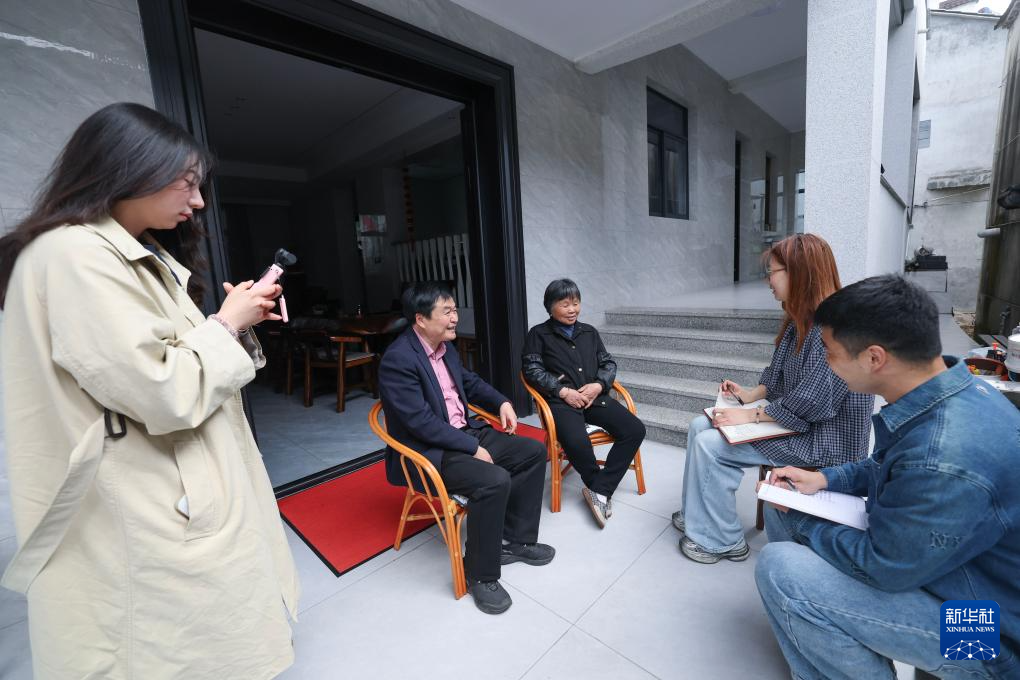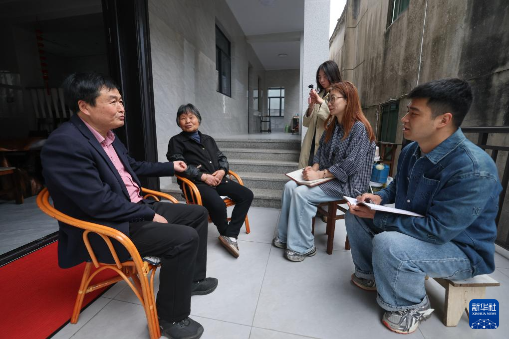4月4日,冯贝贝(右二)和周烨(右一)在十里坪村党总支书记卓任翔(左一)的带领下走访村民,了解民生保障服务相关事项,郦泱泱(右三)拍摄视频素材。新华社记者 徐昱 摄