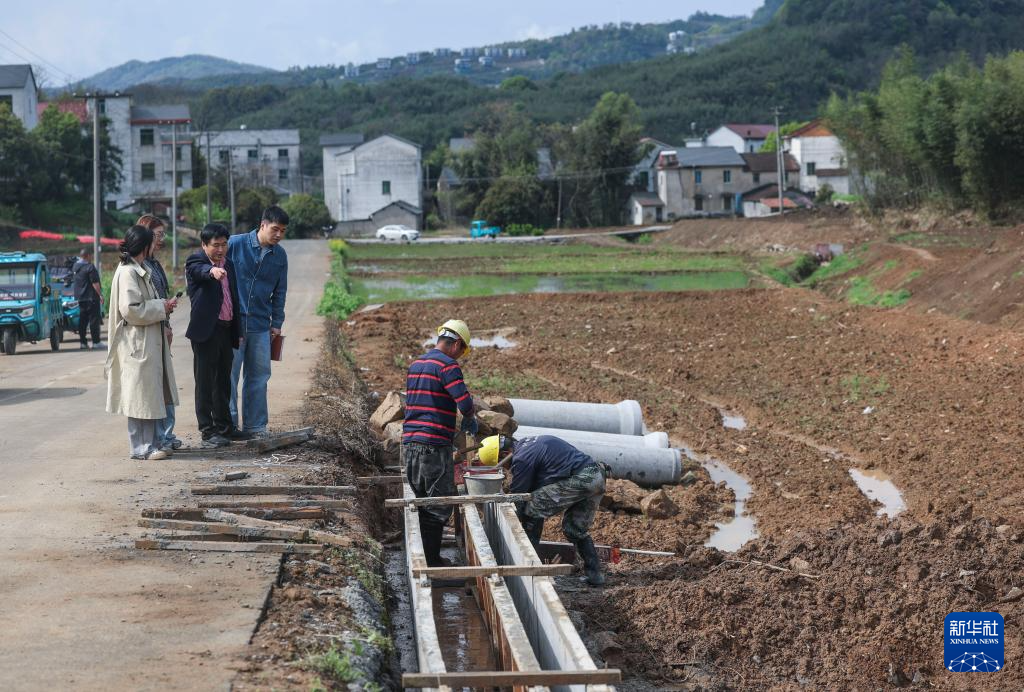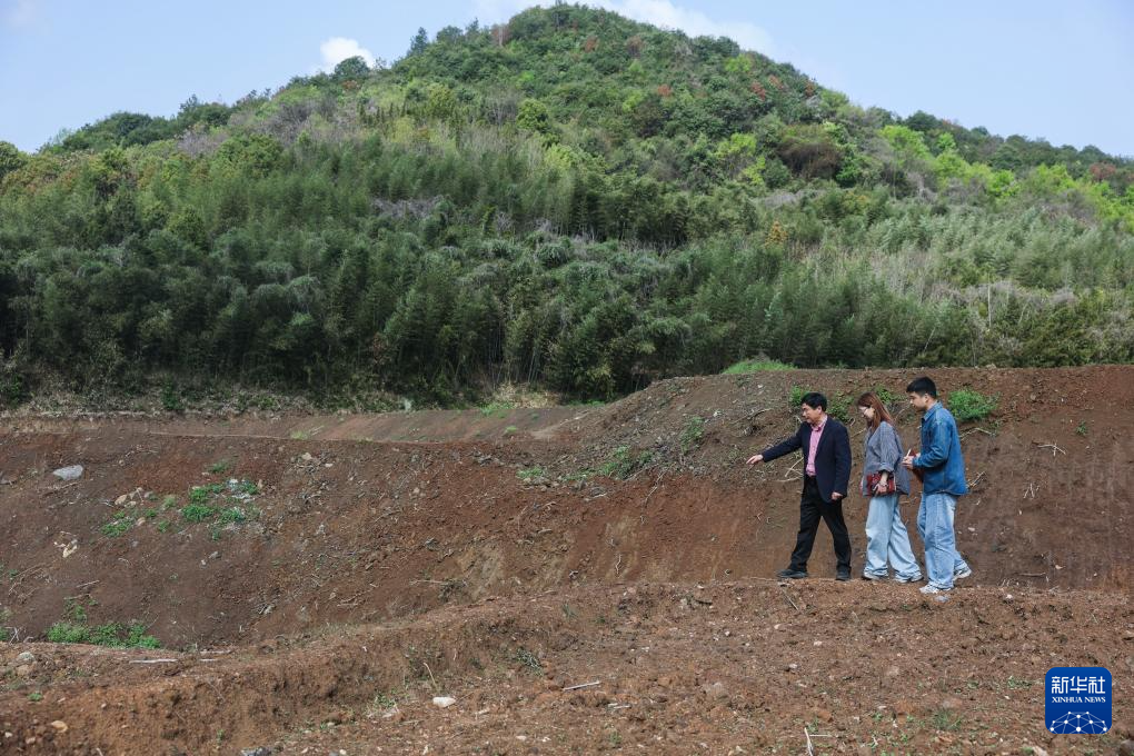 4月4日,十里坪村党总支书记卓任翔(中)带领郦泱泱、冯贝贝、周烨踏勘春耕备耕现场以及农用设施建设进度。新华社记者 徐昱 摄