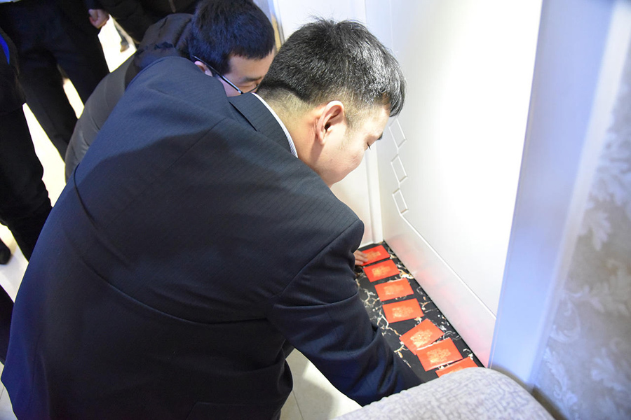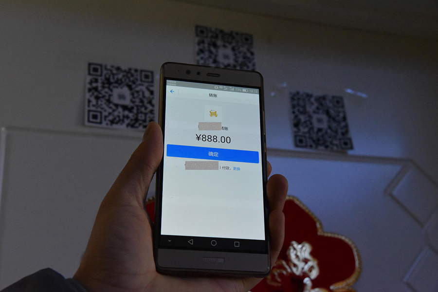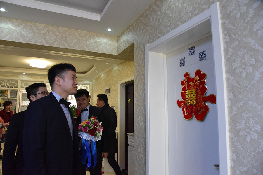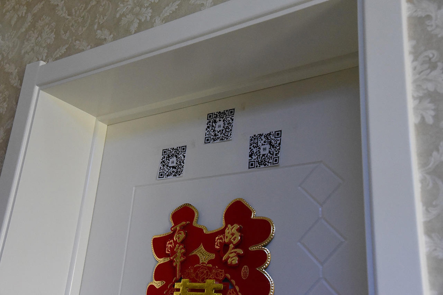 小伙子们把剪好的二维码贴在门上,分别是三个不同的金额:888元、666元和520元,当然这一道关新郎压根儿不知道,更别说金额。
