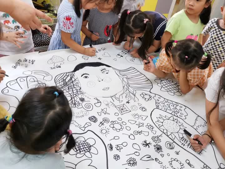 在这幅画上,记者看到孩子们画出了各种各样的造型,其中有老师衣服上写实的图案,也有孩子们喜欢的动画人物、花草树木等。