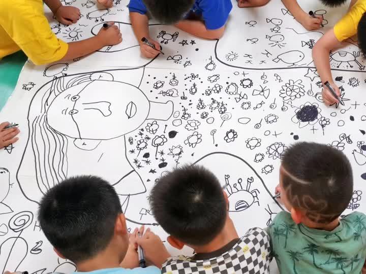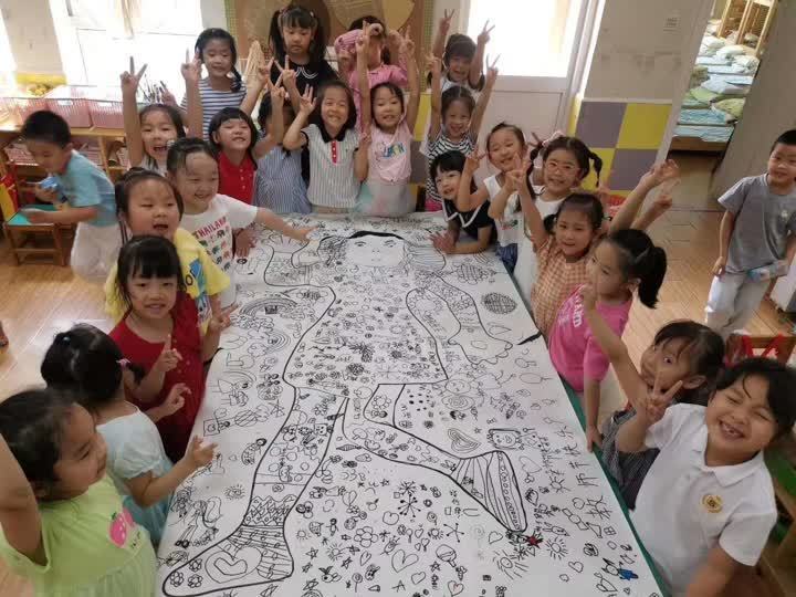 孩子到了大班了,想让他们自由表现一下,也是为了培养他们小组合作能力。我们躺在桌子上,孩子们先把外轮廓画出来,然后再添一些东西画上去。