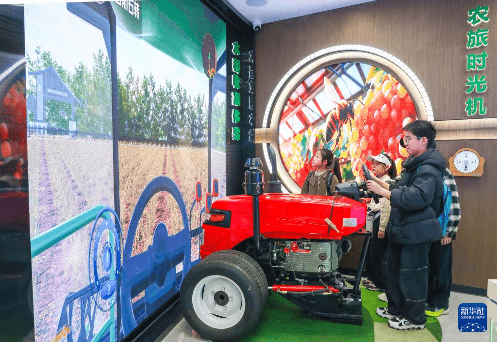 4月2日,在江苏省江都现代农业产业园,孩子们模拟驾驶拖拉机。