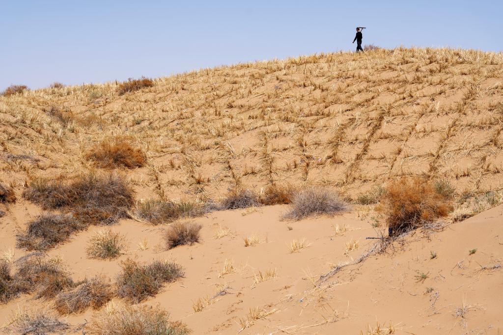 4月10日,在古浪县八步沙林场麻黄塘沙区,郭玺在沙漠里种植花棒。