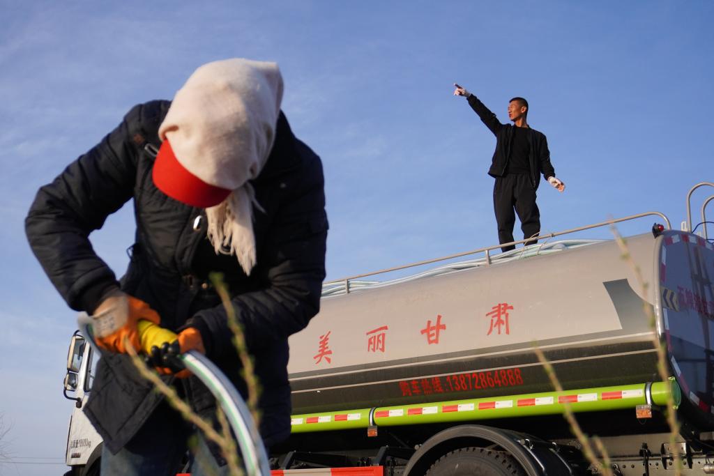 4月10日,在古浪县八步沙林场蓄水池,郭玺给洒水车加水。