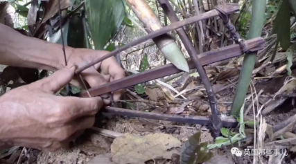 一名中年男子穿着树皮做的衣服,正用树枝和木条制作一个简易的捕鼠装置…