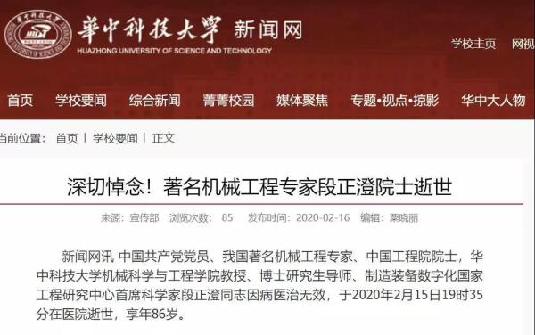 2月15日晚,正处于疫情风暴眼中的武汉传来一个不幸的消息,中国工程院院士、华中科技大学机械科学与工程学院教授段正澄,因病不幸去世。