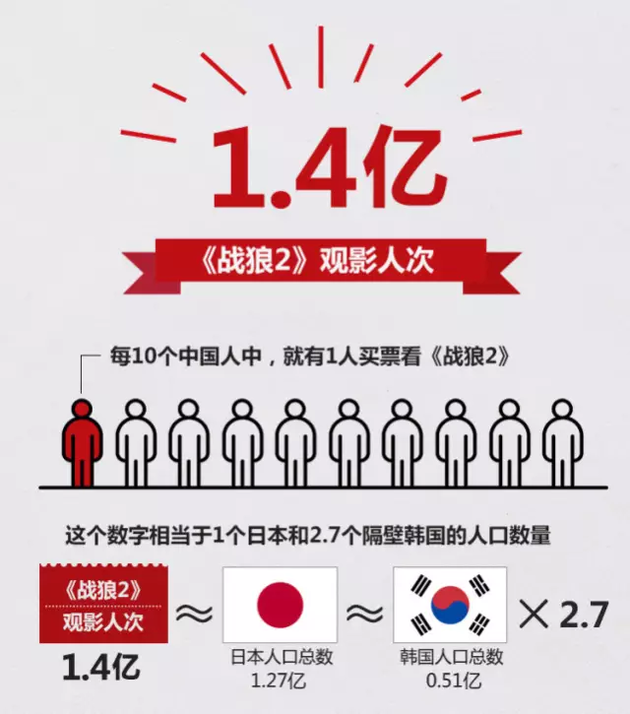 1.4亿的观影人次也是创纪录的水平,这相当于2016年全年内地电影市场观影总人次的十分之一,2007年全年观影人次的总和。《战狼2》的数据,不仅反映了内地电影市场的现状,更让大家看到了未来的新希望。