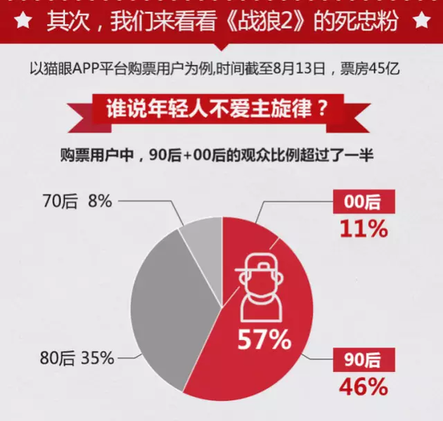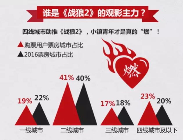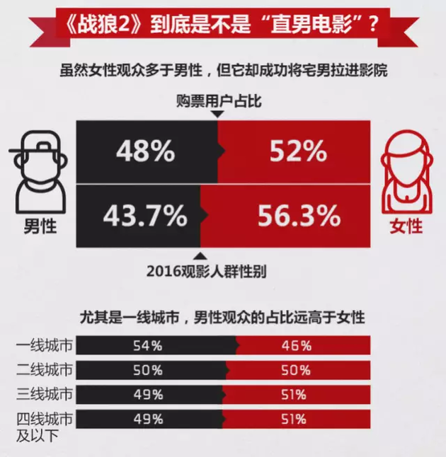 从《战狼2》的数据中我们也不难看出,一部现象级大片的出现,在抓住女性观众和引燃“小镇青年”这两点上的必要性。