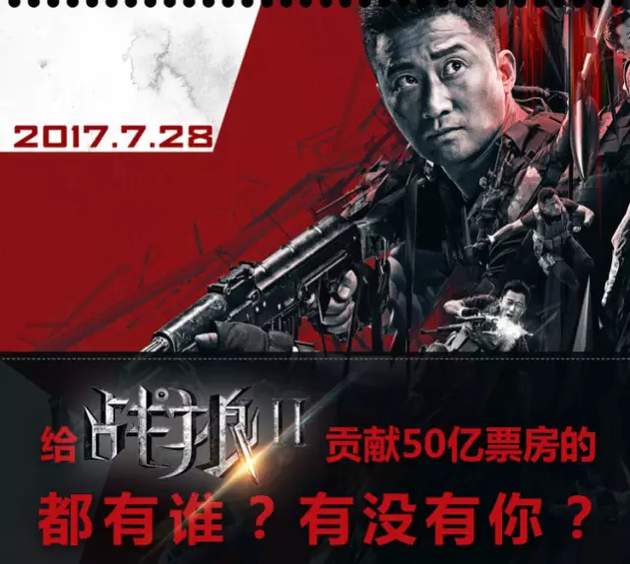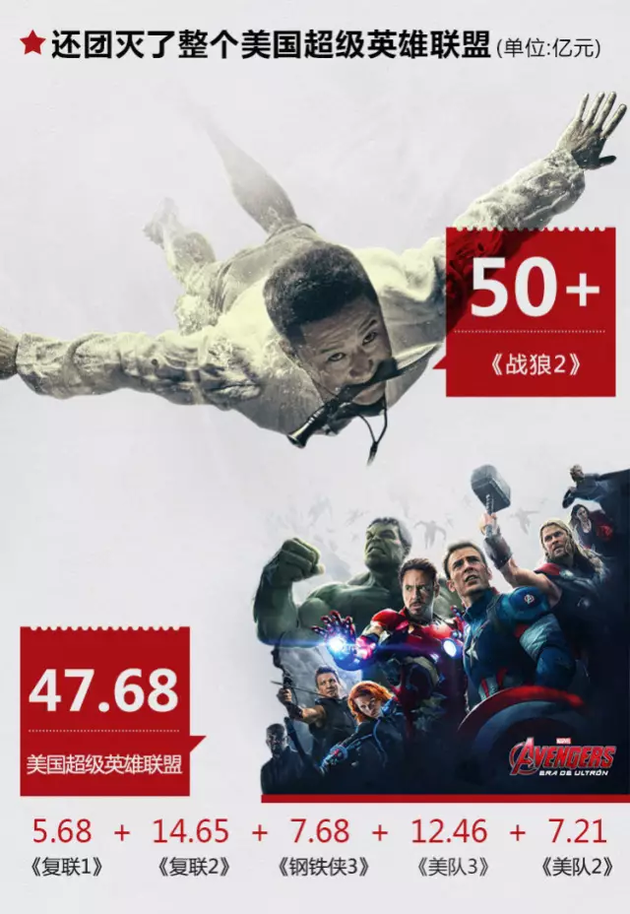 票房50亿是什么概念?一部《战狼2》的票房超过了5部漫威超级英雄大片的内地票房总和。