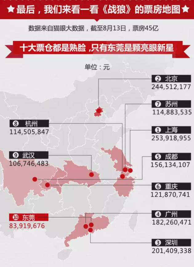 10大票仓城市中,过去像南京、西安这样的票房重镇都没有上榜。而东莞和苏州这样在地理层面上相对较小的城市,反而产出了更高的票房。