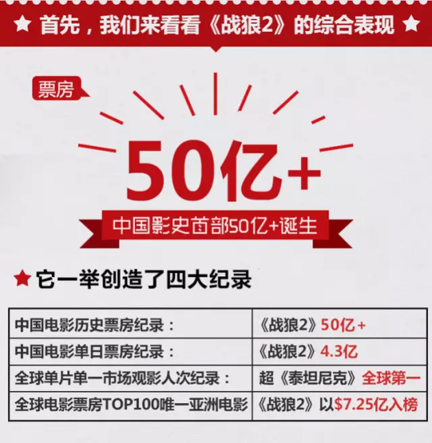截至8月23日晚,《战狼2》累积的综合票房达到了52.37亿,分账票房(去除服务费)48.93亿。这意味着本片不仅是中国内地电影历史上第一部票房达到50亿+级别的电影,更让中国电影市场“走进新时代”。