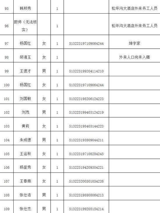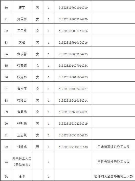 25日中午,叠溪镇两河口村村民张连刚说,名单上9人是他的亲人,现在都已联系上,均已回到新磨村。他们分别是65号颜盈、100号颜双、108号张仕浩、109号张仕杰、110号张世瑞、111号张世朝、112号张仕会、113号张娇、114号张世伟。
