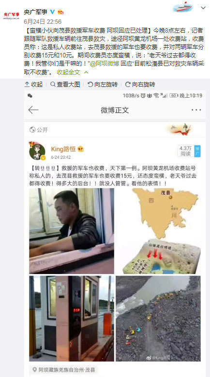 24日8点左右,记者跟随军队救援车辆前往茂县救灾,途径阿坝黄龙机场一处收费站,收费员称:这是私人收费站,去茂县救援的军车也要收费,并对两辆军车分别收费15元和10元。期间收费员态度蛮横,说:"老天爷过去都得收费!我管你们是干嘛的!"@阿坝微博回应"目前松潘县已对救灾车辆采取不收费"。