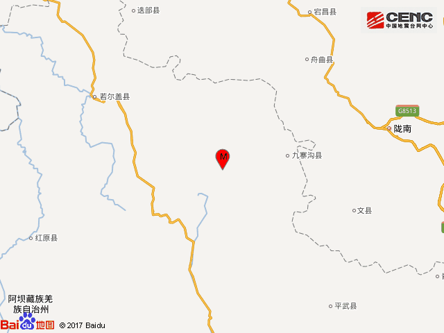 据中国地震台网正式测定,8月8日21时19分在四川阿坝州九寨沟县发生7.0级地震,震源深度20千米,震中位于北纬33.20度,东经103.82度。