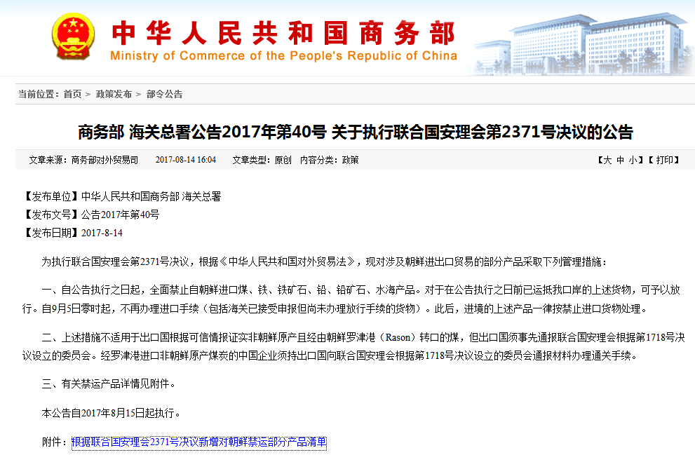 8月14日,商务部和海关总署联合发布公告称,自8月15日起,全面禁止自朝鲜进口煤、铁、铁矿石、铅、铅矿石、水海产品。对于在公告执行之日前已运抵我口岸的上述货物,可予以放行。自9月5日零时起,不再办理进口手续(包括海关已接受申报但尚未办理放行手续的货物)。此后,进境的上述产品一律按禁止进口货物处理。