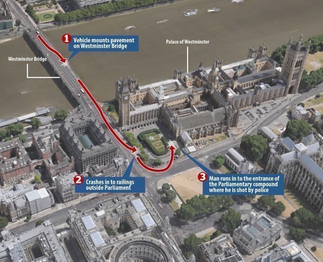 当地时间22日下午2时35分左右,袭击者驾车冲上威斯敏斯特大桥(Westminister Bridge)的行人道,冲撞辗压至少5人,包括3名警察。随后车辆撞上议会前院的外墙,袭击者持刀攻击议会大厦外警员,并试图闯入议会大厦内,在一名警察受伤后,现场其他便衣警员持枪及时枪击阻止了袭击者。