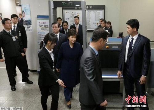 资料图:朴槿惠在安保人员的保护下离开居住地。