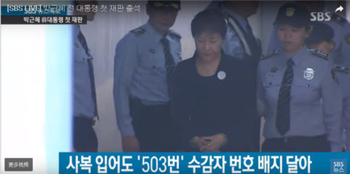朴槿惠当天上午8时36分左右从首尔拘留所出发,审判开始前50分左右抵达首尔法院综合大楼。她身着私服,保留了和她标志性发髻有些相似的发型,但胸前佩戴了写有囚号503的胸章。