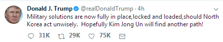 这还不够,一向遵循推特治国的特朗普免不了在社交媒体上发表“伟大”言论,称美国各项军事方案已经就位,随时准备“装弹上膛,对朝开火”!并警告金正恩另寻他路。